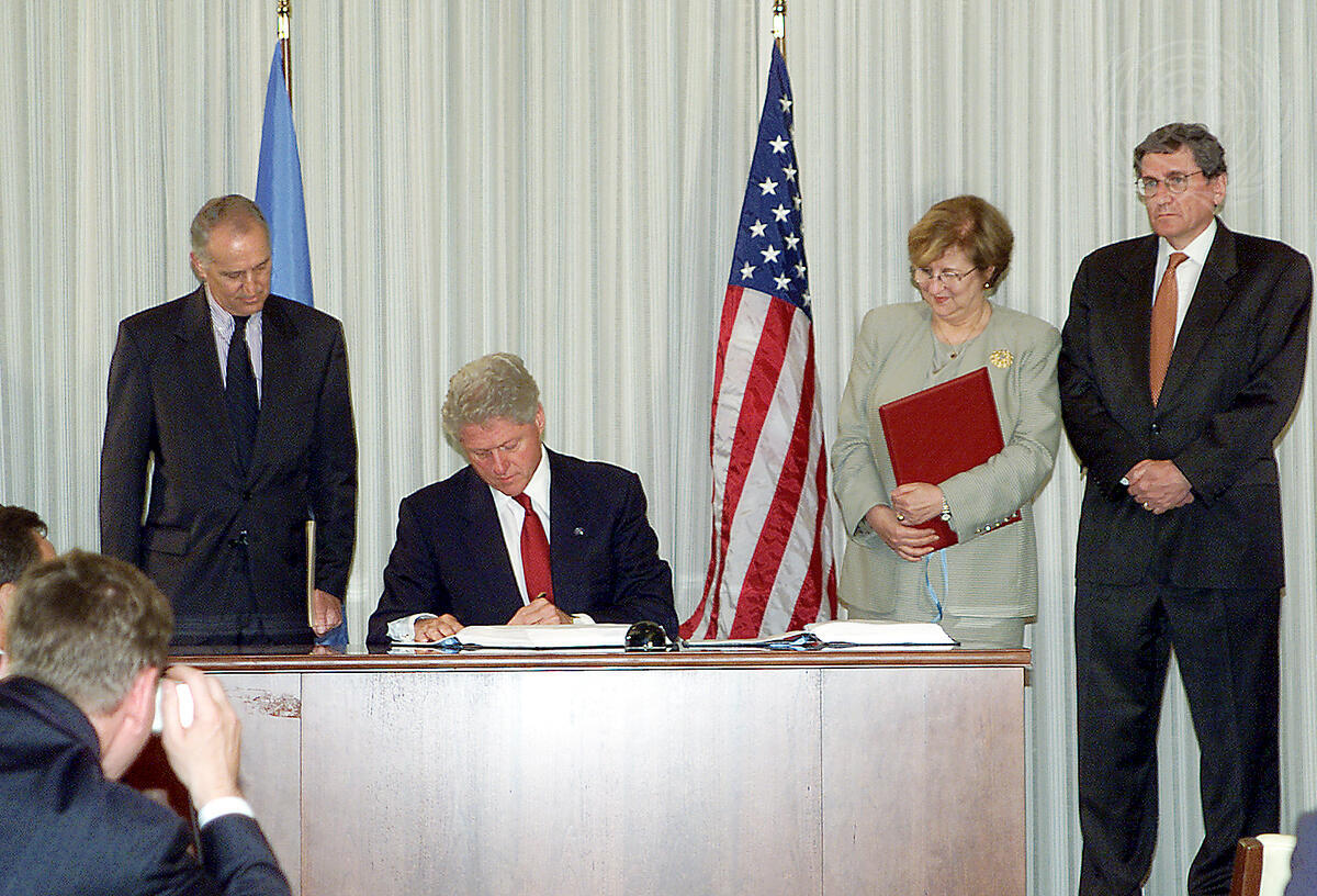 Shown is the United States President William Clinton (centre) signing the optional protocols, as Deputy Secretary-General Louise Fréchette looks on. Right is Ambassador Richard Holbrooke, Permanent Representative of the United States to the United Nations. Left is Ralf Zacklin, Assistant Secretary-General and Deputy to the Under-Secretary-General for Legal Affairs.