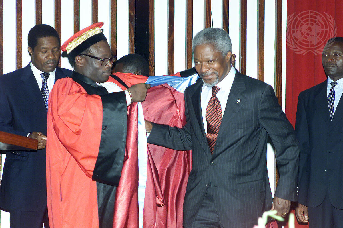 Secretary-General Kofi Annan (centre, right) receives an honorary doctorate in international relations from the University of Yaounde II.