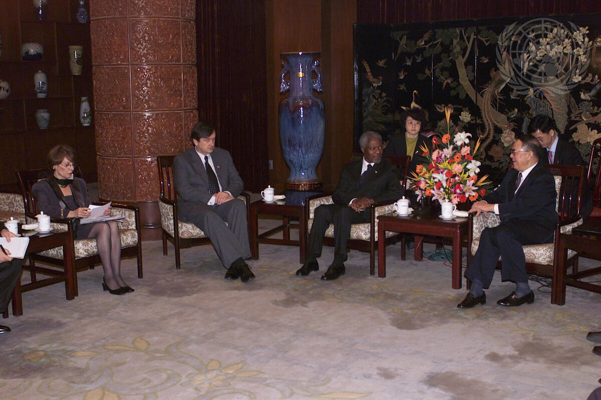 Secretary-General Kofi Annan (second from right) meets with Song Jian (far right), Vice Chairman of the Chinese People's Political Consultative Conference. Also present, from the Secretary-General's delegation, are Elisabeth Lindenmayer (far left) and Danilo Türk (second from left), UN Assistant Secretary-General for Political Affairs.