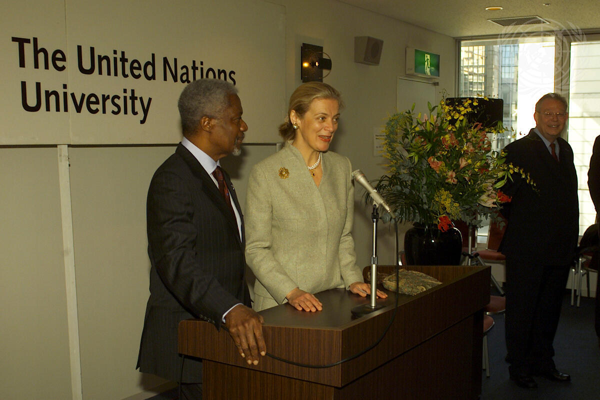 Secretary-General Kofi Annan and Mrs. Nane Annan addressing the staff of the United Nations University (UNU). Far right is the Rector of UNU, Hans van Ginkel.