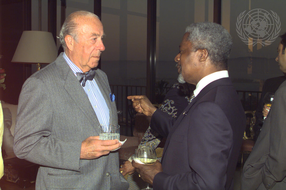 Secretary-General Kofi Annan (right) with the former US Secretary of State, George P. Shultz, at a dinner hosted by the former Secretary of State and his wife, Helena M. Shultz, at their residence.