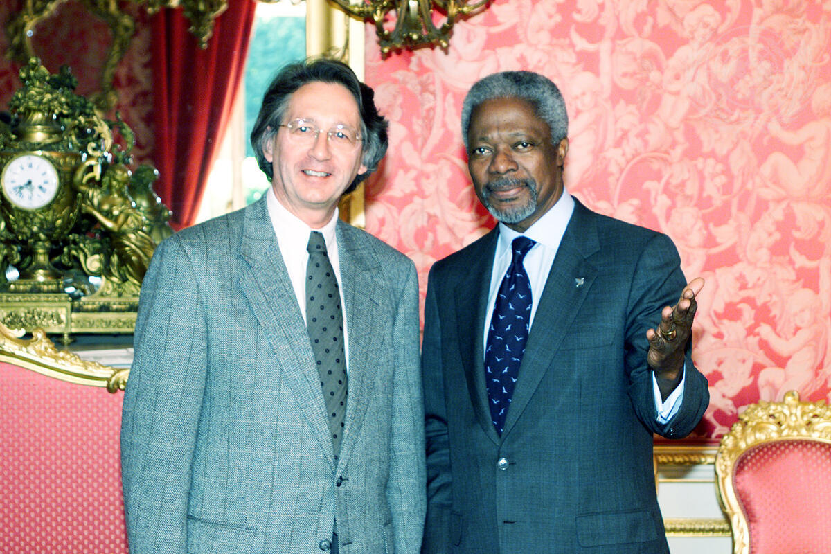 Secretary-General Kofi Annan (right) with Eric Deryke, Foreign Minister of Belgium, at Noordeinde Palace in The Hague.