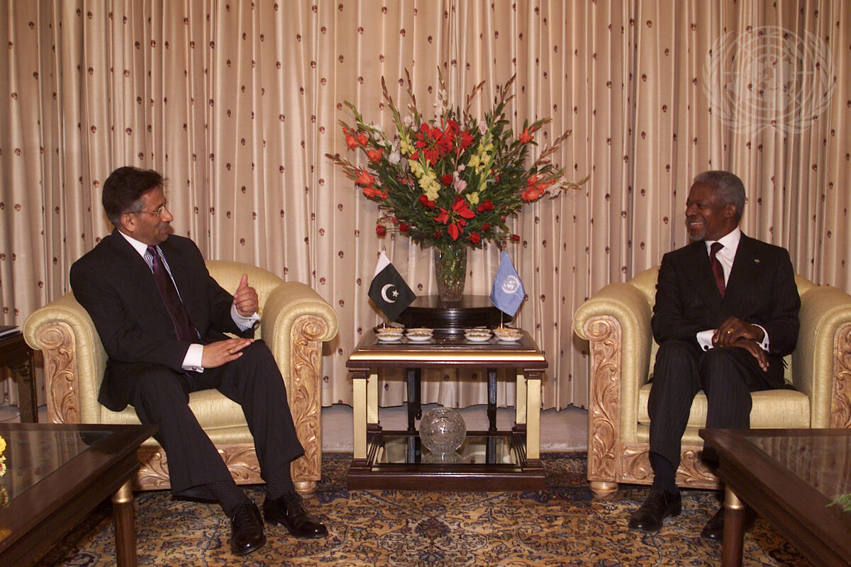 Mr. Annan (right) meets with Pervez Musharraf, President of Pakistan.