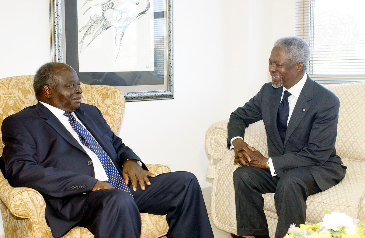 Secretary General Kofi Annan (right) meets with Mwai Kibaki, President of Kenya, in bilateral meetings at his office in the Conference Center.