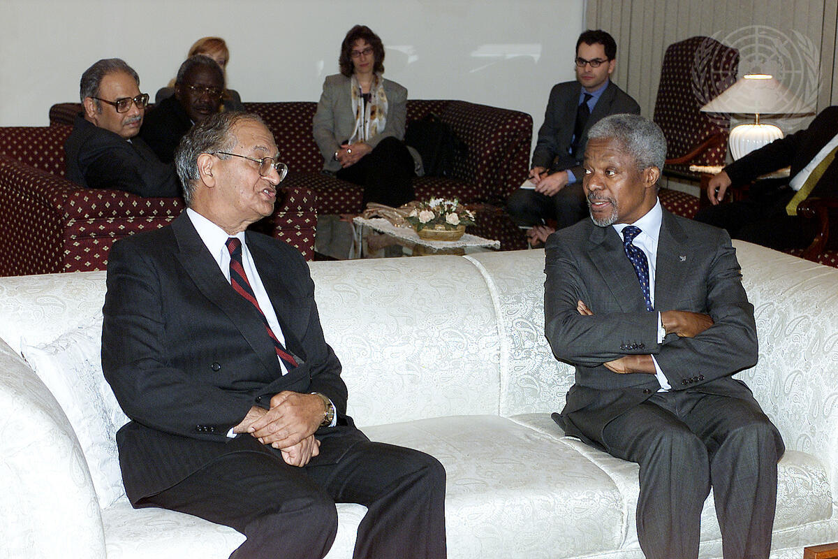 Secretary-General Kofi Annan is welcomed by Abdul Sattar (left), the Foreign Minister of Pakistan, upon his arrival at the Chaklala Air Base.