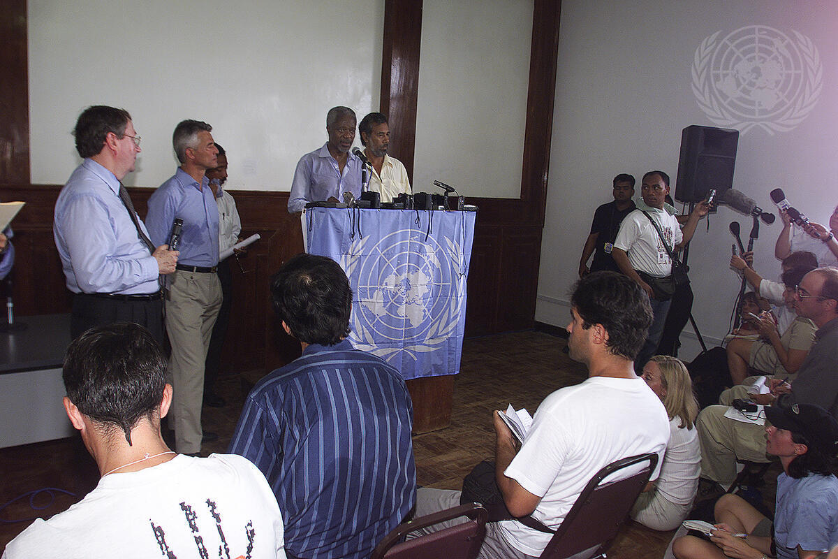 Secretary-General Kofi Annan (left, at podium) speaking at a press conference following his address to the people of East Timor. Right, at podium, is independence leader Kay Rala Xanana Gusmão and, standing left, is UN Transitional Administrator Sergio Vieira de Mello.
