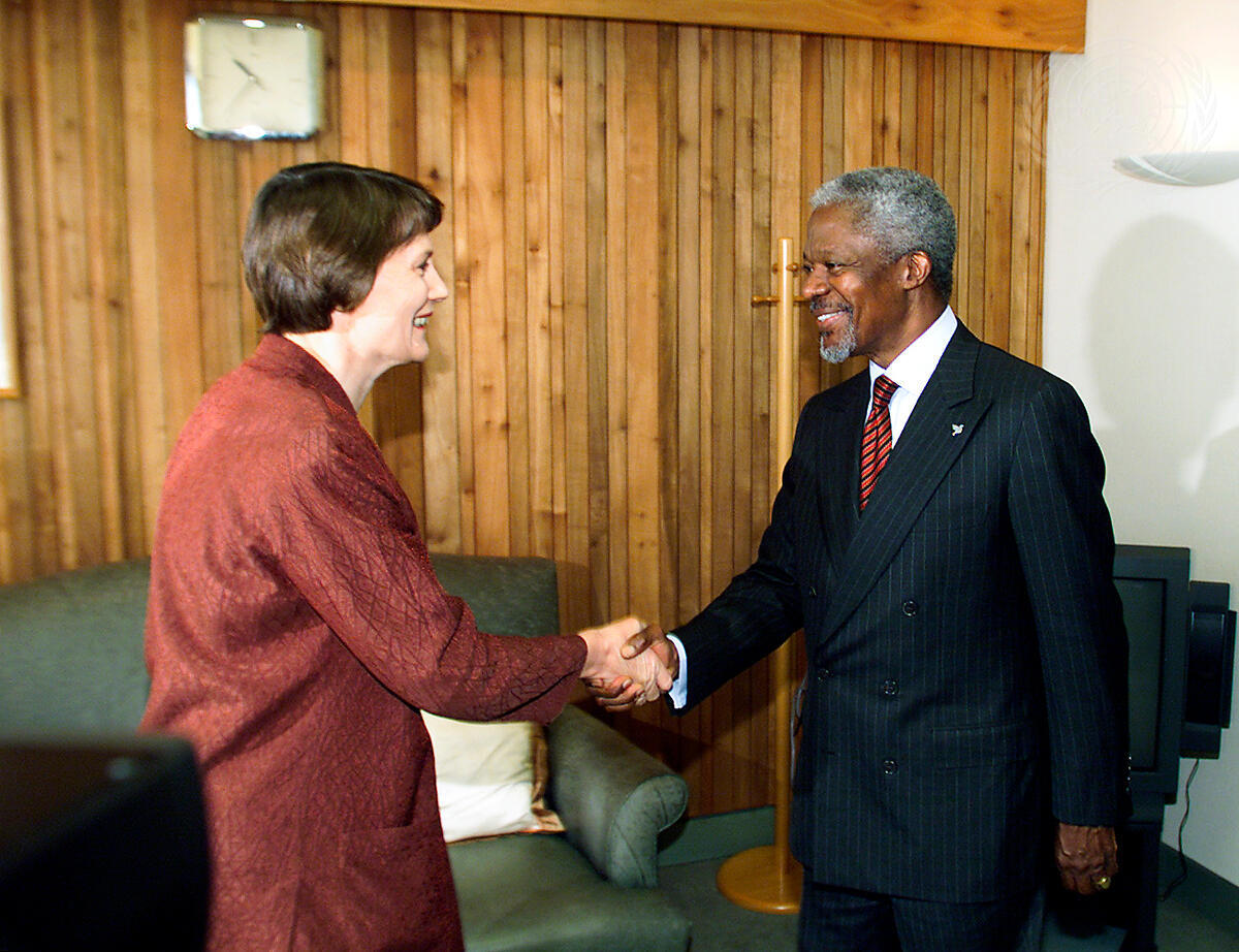 Secretary-General Kofi Annan (right) meeting Helen Clark, Prime Minister of New Zealand, at Parliament House in Wellington.