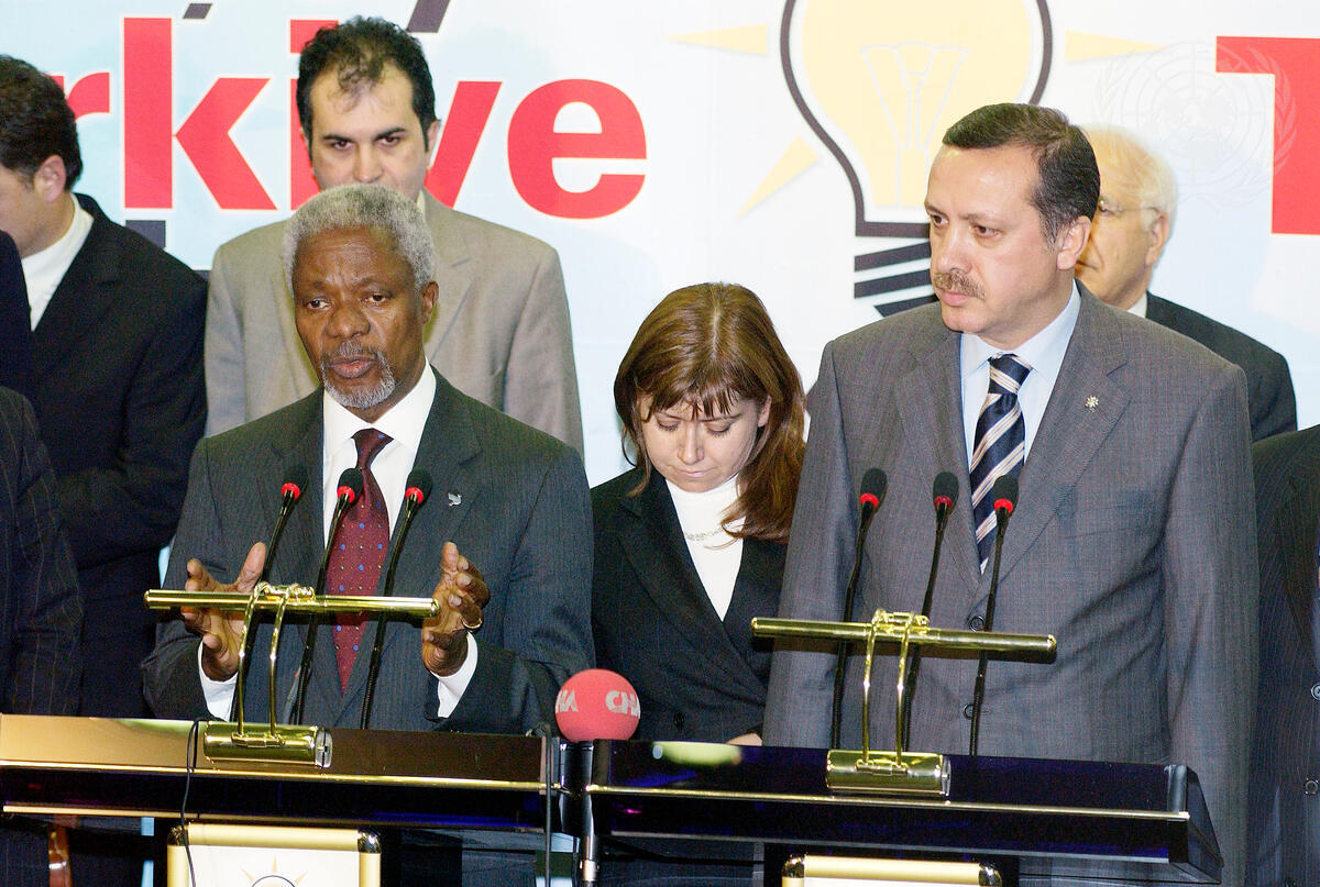 official visit. Mr. Annan (left) and Recep Tayyip Erdogan (right), Leader of the Justice and Development Party of Turkey, at a joint press conference at the Party's Headquarters in Ankara.
