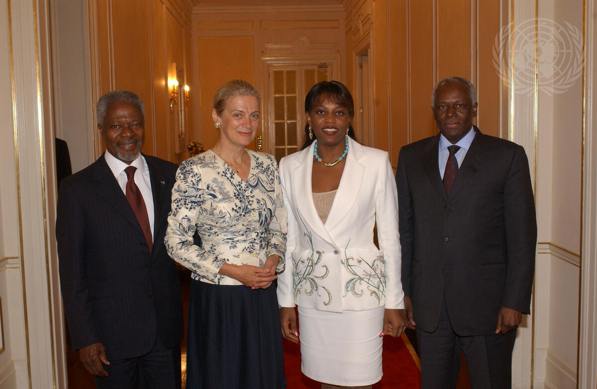 Secretary-General Kofi Annan (left) and Nane Annan (second from left) meet with José Eduardo dos Santos (right), President of the Republic of Angola, and First Lady Mrs. dos Santos.