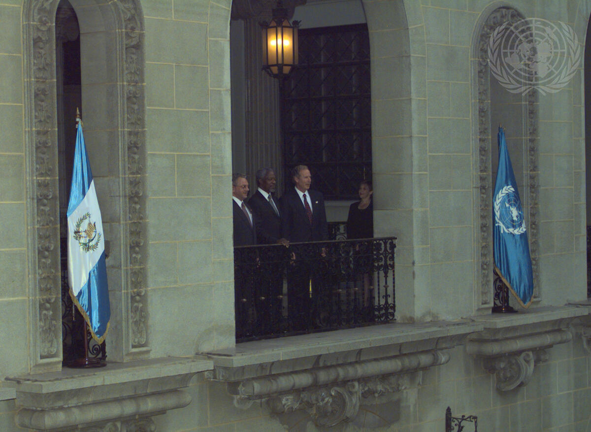 Standing on the balcony of the National Palace in Guatemala City, left to right: Eduardo Stein Barillas, Minister for Foreign Affairs of Guatemala; Secretary-General Kofi Annan; and Alvaro Arzu Irigoyen, President of Guatemala.