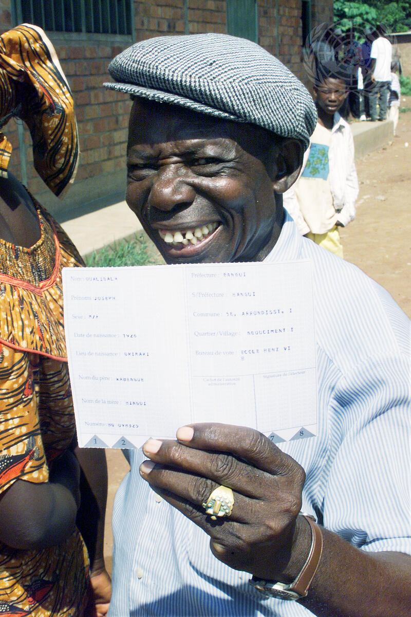A man proudly displays his identity card which allows him the right to vote.