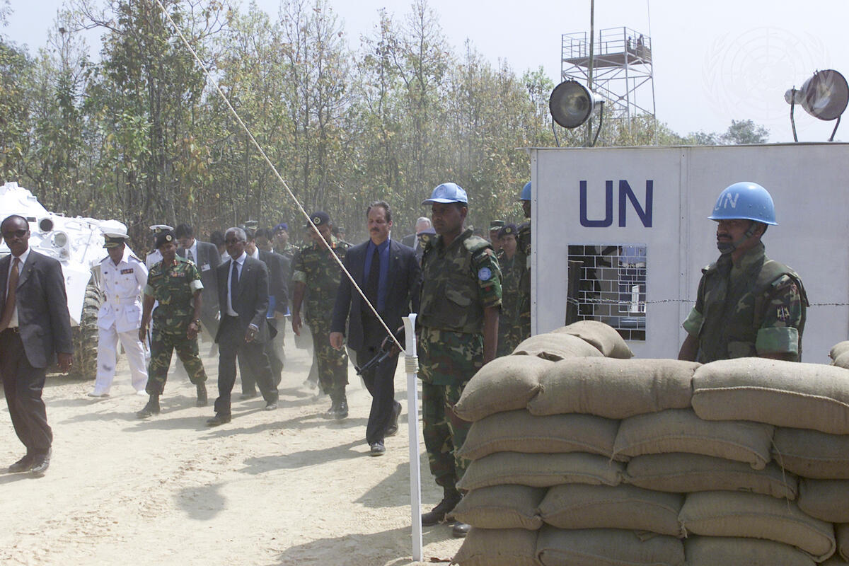 Secretary-GeneraI Kofi Annan visits the Peacekeeping Operations Training Centre at Rajendrapu. where he was briefed on the training programme for Bangladeshi military who will serve in United Nations peacekeeping missions. Bangladesh is currently the second largest contributor of troops to such operations, with some 4,500 soldiers in various missions worldwide. The Secretary-General (fourth from left) at a replica of a typical United Nations checkpoint.