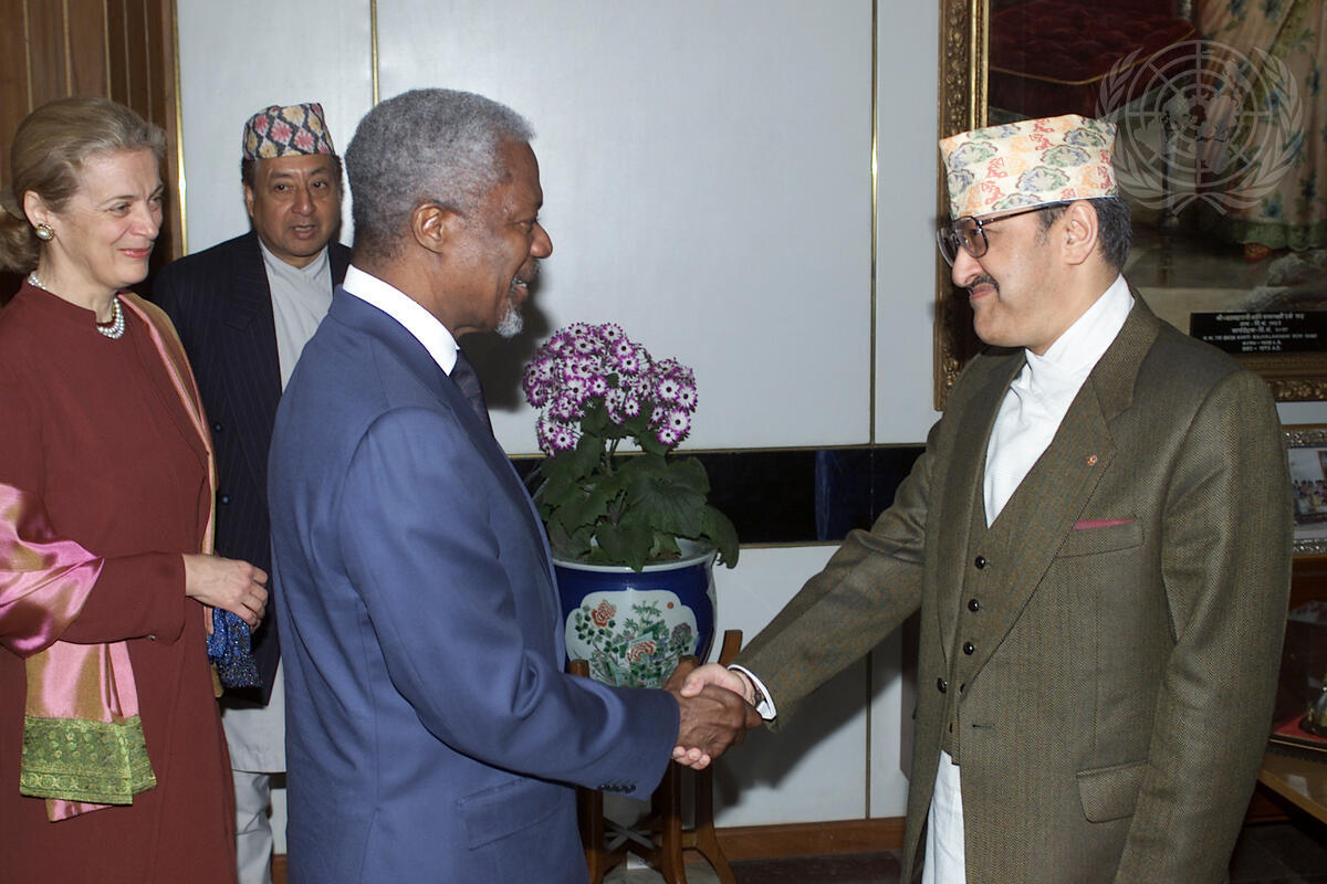 Secretary-General Kofi Annan is welcomed by King Birendra Bir Bikram Shah Dev of Nepal (right) at Narayanhity Royal Palace. Looking on (left) is Mrs. Nane Annan.