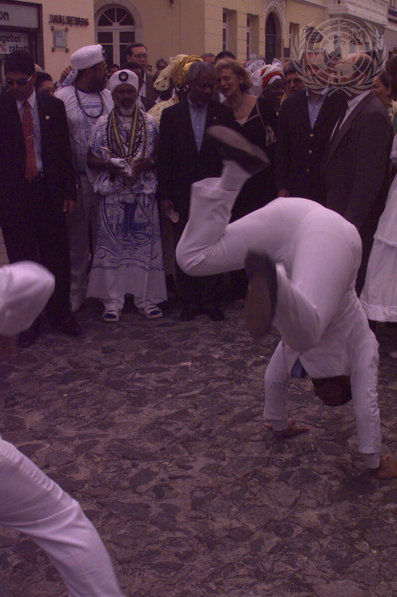 On the streets of the city, the people of Salvador de Bahia, wearing traditional costumes, welcome Secretary-General Kofi Annan (center) and Mrs. Nane Annan (center right).