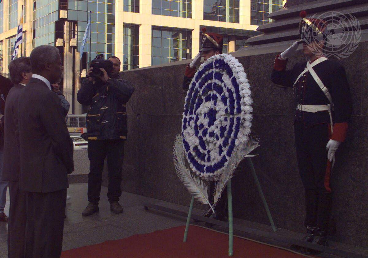 Secretary-General Kofi Annan (left) at a wreath-laying ceremony at the monument to the national hero, General José Gervasio Artigas, at the Plaza Independencia.