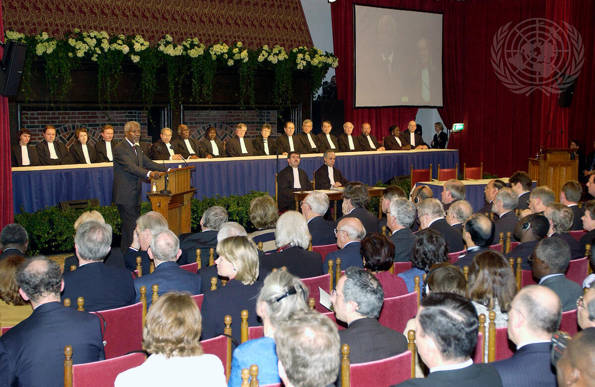 Secretary-General Kofi Annan (right, standing at podium) speaking at the ICC Inaugural Cermonies.