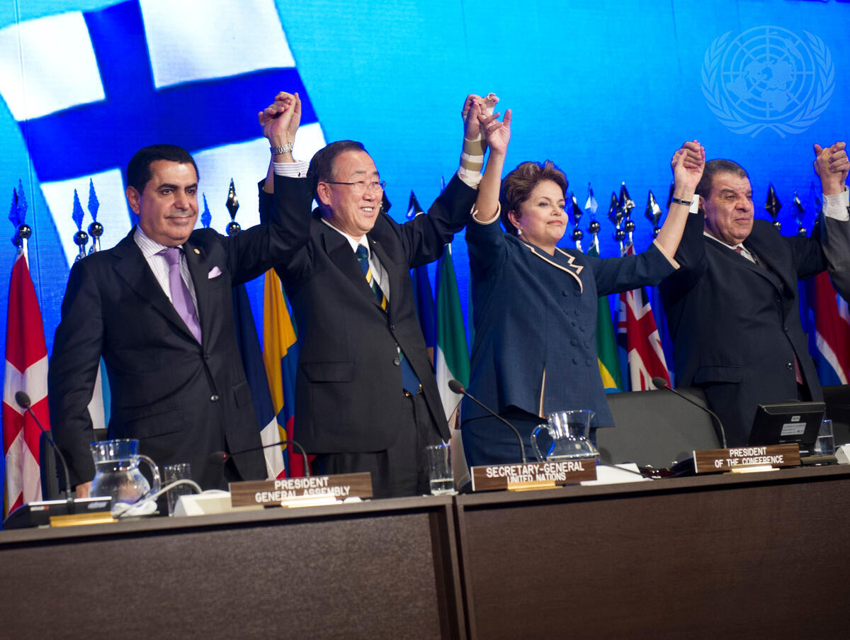 From left: General Assembly President Nassir Abdulaziz Al-Nasser; Secretary-General Ban Ki-moon; Dilma Rousseff, President of Brazil; and Muhammad Shaaban, Under-Secretary-General for General Assembly Affairs and Conference Management; at the Rio+20 closing ceremony.