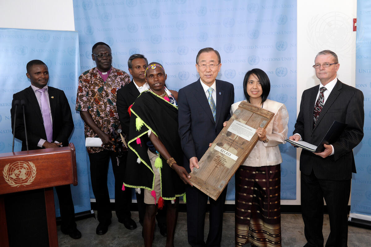 Secretary-General Ban Ki-moon (third from right) accepts a petition to support the Arms Trade Treaty from former child soldier and Kenyan athlete Julius Arile (centre) and Jasmin Nario-Galace (second from right), Secretariat Coordinator for the Philippine Action Network to Control Arms (PhilANCA). Additional members of the Control Arms Coalitions presenting petitions and declarations include, from left: Dr. Ogebe Onazi, International Physicians for the Prevention of Nuclear War (IPPNW); former child soldier Bishop Elias Taban; Salil Shetty, Secretary General of Amnesty International; and Ross Robertson, Assistant Speaker MP for Manukau East, New Zealand.