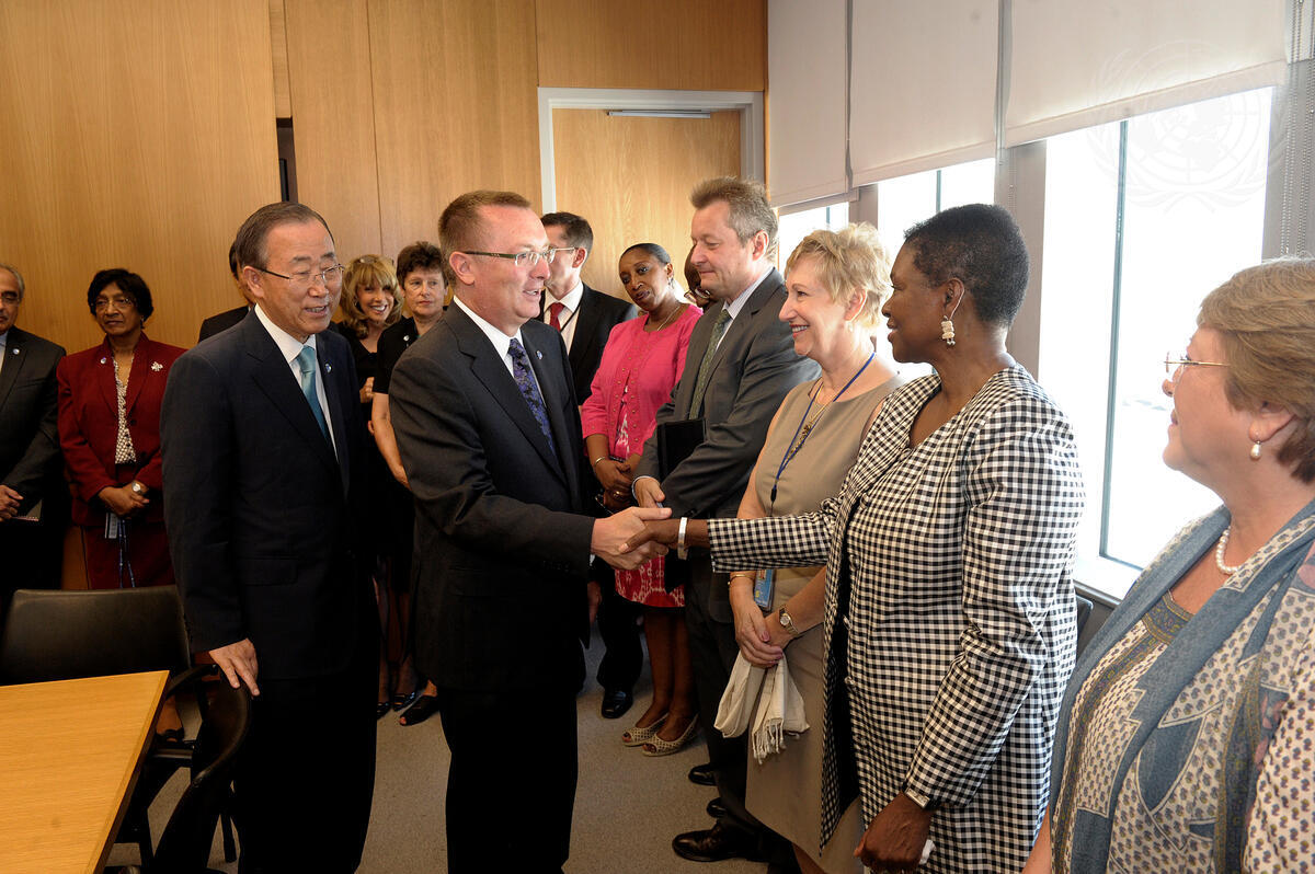Jeffrey D. Feltman (centre), Under-Secretary General for Political Affairs, greets Valerie Amos, Under-Secretary-General for Humanitarian Affairs and Emergency Relief Coordinator, following his swearing-in ceremony. At centre left is Secretary-General Ban Ki-moon.