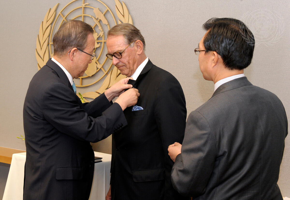 Secretary-General Ban Ki-moon (left) affixes a UN lapel pin for Deputy Secretary-General Jan Eliasson, after Mr. Eliasson was sworn in.