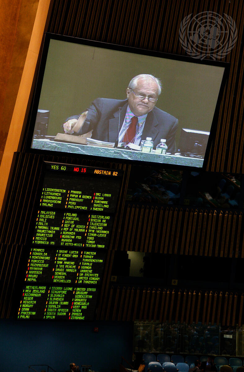 A view of the electronic board in the Assembly Hall with the result of the vote. Chairing the meeting was Martin Sajdik (shown on screen), Permanent Representative of Austria to the UN and Vice-President of the Assembly.