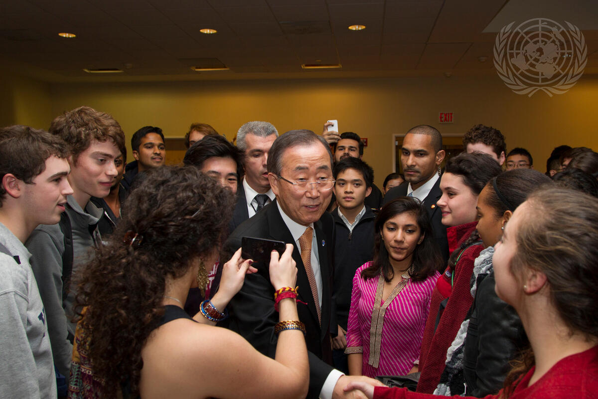 Secretary-General Ban Ki-moon is greeted by students after delivering Yale University’s George Herbert Walker, Jr. Lecture in International Studies, at the Yale campus in New Haven, Connecticut.