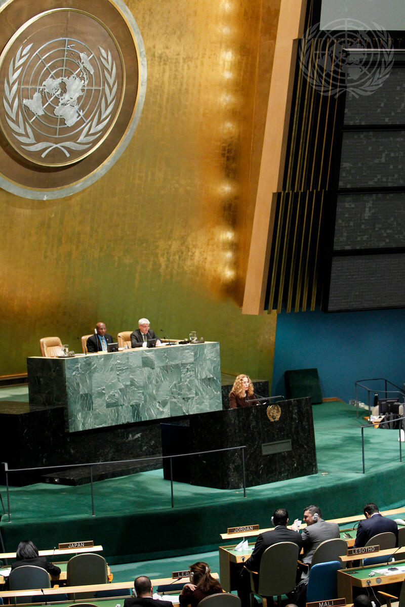 A view of the General Assembly Hall as Laura Dupuy Lasserre (seen at speaker's podium), President of the Human Rights Council, presents the Council's report to the General Assembly. Seated behind her: Rodney Charles (left), Permanent Representative of the Republic of Trinidad and Tobago to the UN and Vice-President of the sixty-seventh session of the General Assembly; and Ion Botnaru, Director of the General Assembly and ECOSOC Affairs Division.