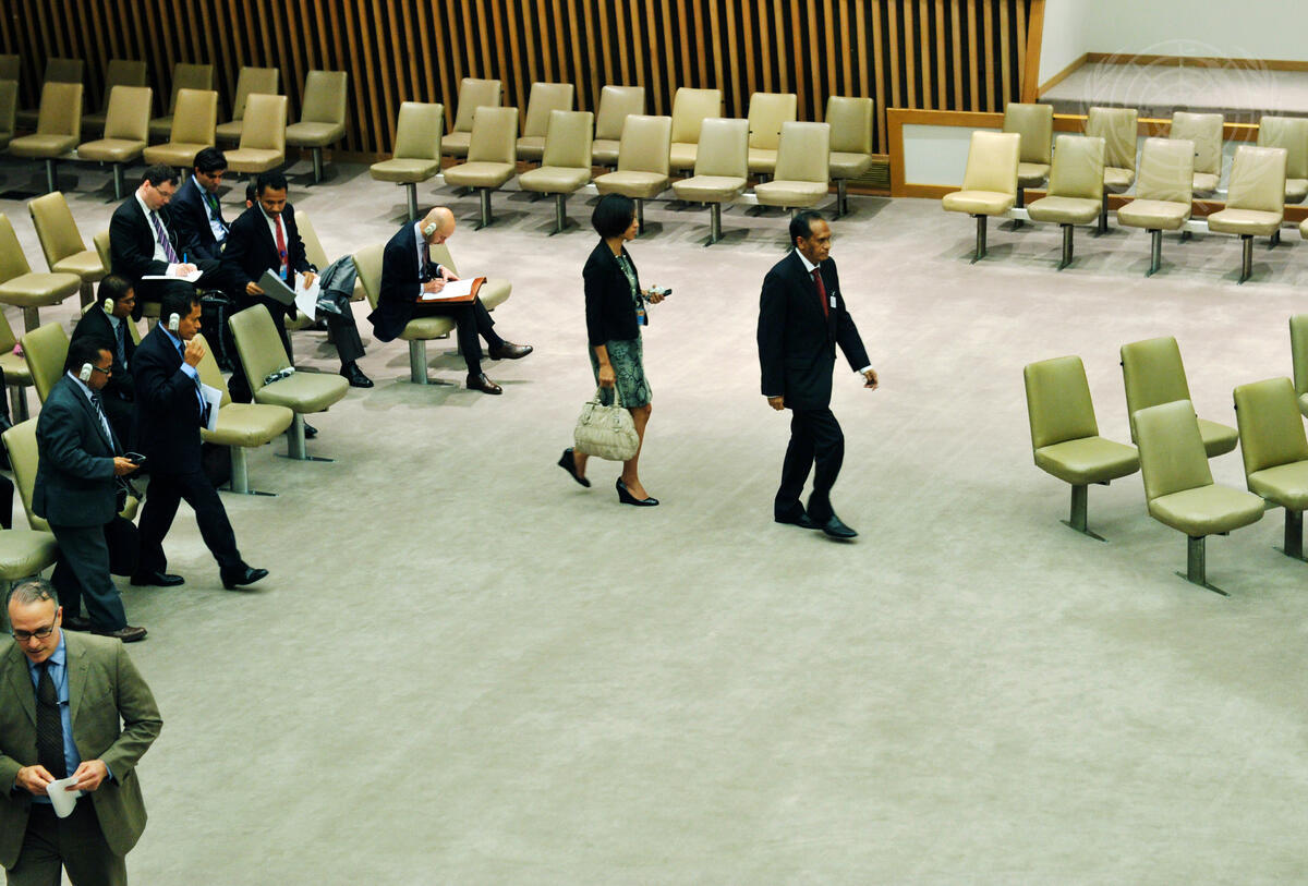 A view of the Security Council Chamber as José Luís Guterres (right), Minister for Foreign Affairs of Timor-Leste, arrives for a meeting of the Council on his country.