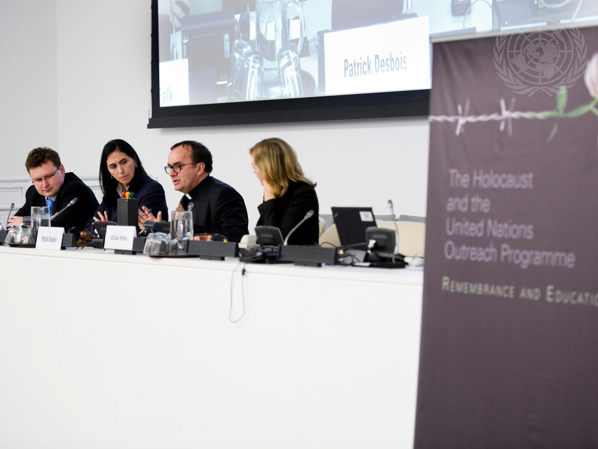 Father Patrick Desbois (second from right), President of Yahad-In Unum, speaks at the event. Also shown (from left): Andrej Umansky, Research Associate at Yahad-In Unum; Pamela Falk, UN Correspondent for CBS News; Gillian Kitley, Senior Officer, Office of the UN Special Adviser on the Prevention of Genocide.