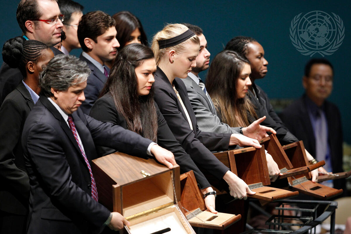 Conference Officers display empty ballot boxes in advance of collecting Member States' ballots during the elections held by the General Assembly for eighteen members of the Human Rights Council.