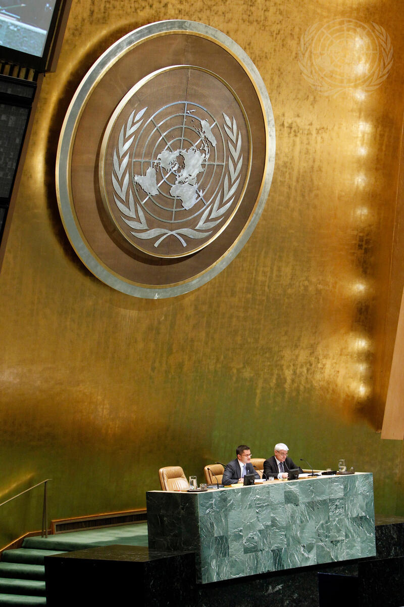At the podium: Vuk Jeremic (left), President of the sixty-seventh session of the Assembly, and Ion Botnaru, Director of the General Assembly and Economic and Social Council (ECOSOC) Affairs Division.