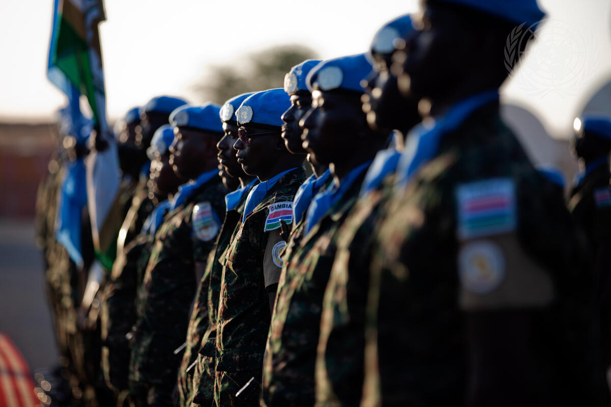Gambian troops of the African Union-UN Hybrid Operation in Darfur (UNAMID) stand in formation for the arrival of Under-Secretary-General for Field Support, Ameerah Haq, at the UNAMID base in El Fasher.