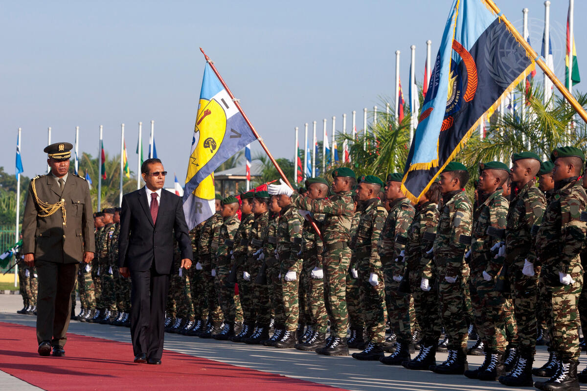 Taur Matan Ruak (centre right), new President of the Democratic Republic of Timor-Leste, reviews the troops on the day of his inauguration, in Dili.