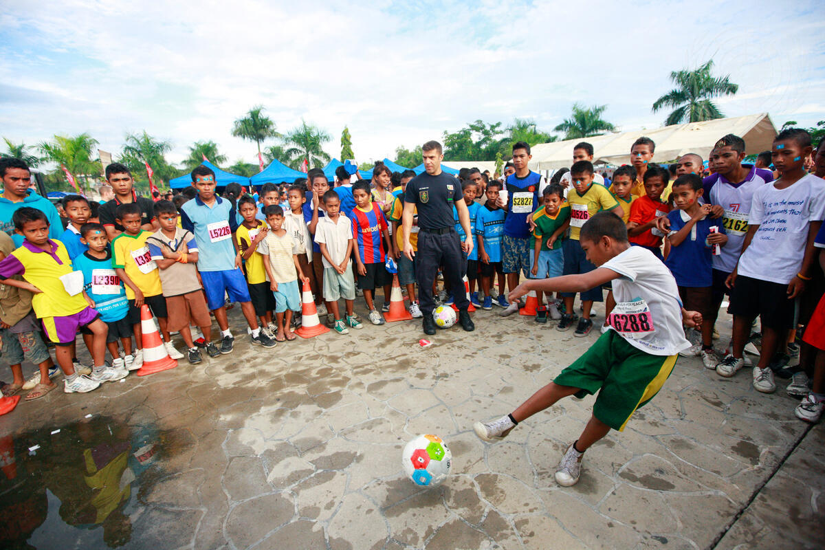 Timorese children and members of the Portuguese Formed Police Unit (FPU), working with the UN’s mission in Timor-Leste (UNMIT), play football on the sidelines of the annual Dili marathon.