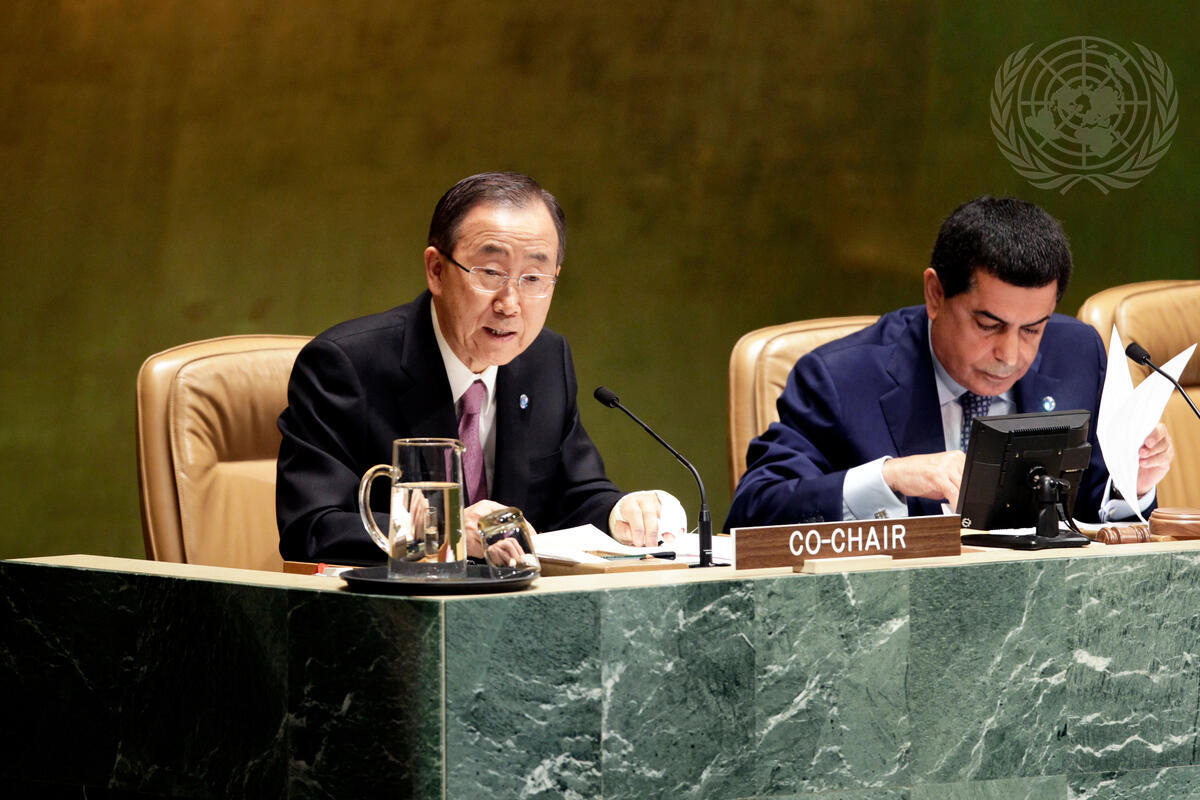 Secretary-General Ban Ki-moon (left) speaks at the high-level debate, “State of the world economy and finance in 2012”, which Mr. Ban convened with President of the General Assembly, Nassir Abdulaziz Al-Nasser (on right).