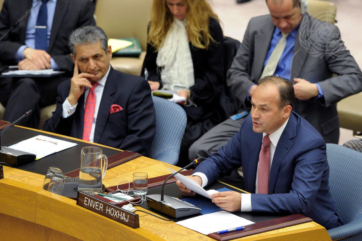 Enver Hoxhaj (right), representative of Kosovo, addresses the Council.