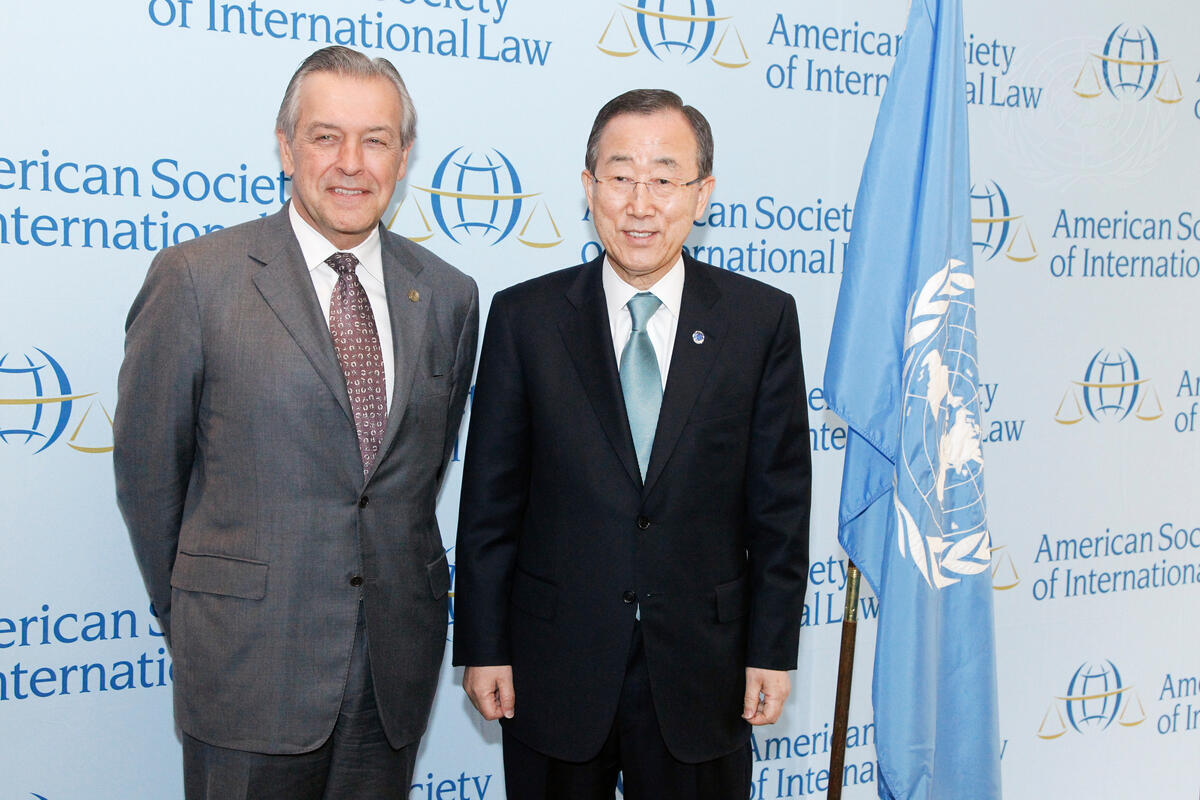 Secretary-General Ban Ki-moon (right) meets with David Caron, Honorary Vice President of the American Society for International Law, before addressing the Society, in Washington, D.C.