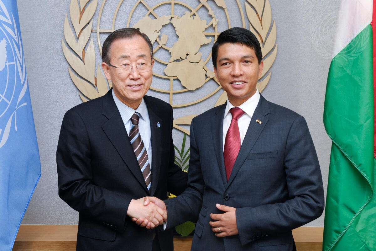 Secretary-General Ban Ki-moon (left) meets with Andry Nirina Rajoelina, President of the Transition of the Republic of Madagascar.