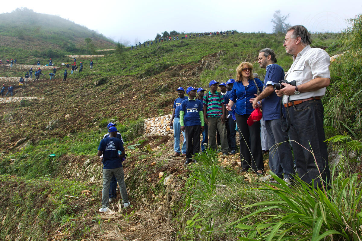Mariano Fernández (right), Head of the UN Stabilization Mission in Haiti (MINUSTAH), visits the cash-for-work programme organized by the Mission in the hilly outskirts of Port-au-Prince. The programme has employed 1345 local residents to build rock walls and plant vegetation, as ways to save arable land and avoid flooding in lower areas.