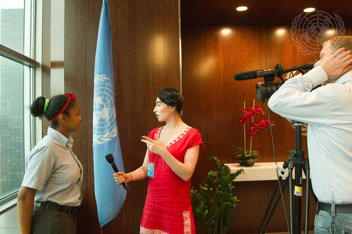 Alexandra King (centre), video producer of the UN News and Media Division, interviews one of the visiting students.