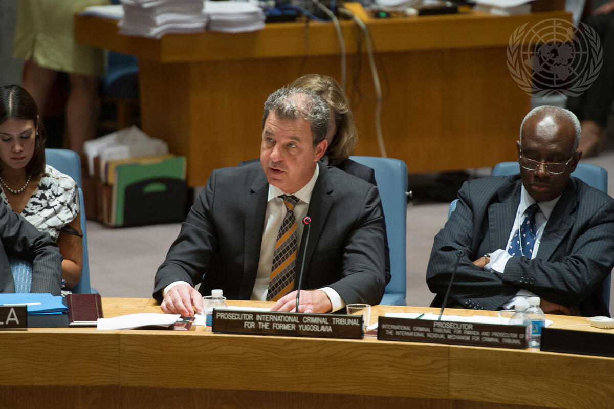 Serge Brammertz (left), Prosecutor of the International Criminal Tribunal for the former Yugoslavia (ICTY), briefs the Security Council. On his left is Hassan B. Jallow, Prosecutor of the International Criminal Tribunal for Rwanda (ICTR).