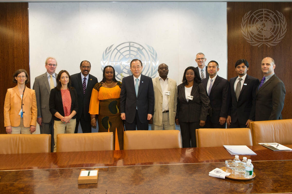 Secretary-General Ban Ki-moon (centre) meets with UN Plus, the United Nations group of HIV positive employees, and Michel Sidibé (fourth from left), Executive Director of the Joint United Nations Programme on HIV and AIDS (UNAIDS).
