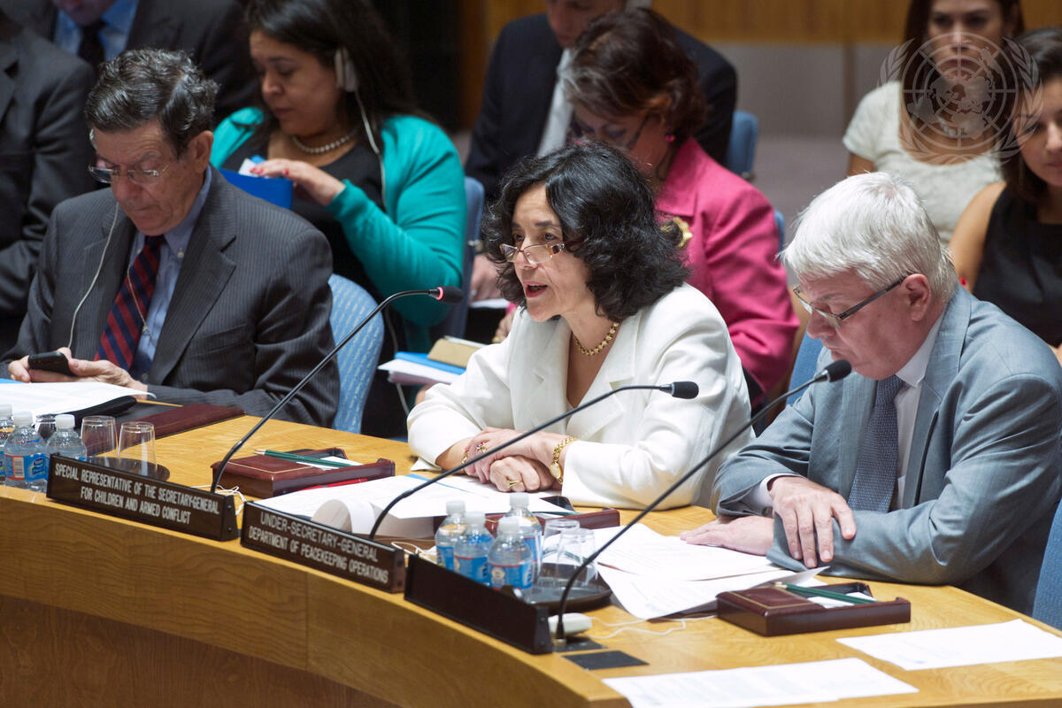 Leila Zerrougui (centre), Special Representative of the Secretary-General for Children and Armed Conflict, addresses the Security Council meeting on the issue. On her left is Hervé Ladsous, Under-Secretary-General for Peacekeeping Operations.