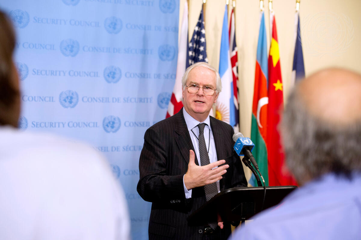 Mark Lyall Grant, Permanent Representative of the United Kingdom to the UN and President of the Security Council for the month of June, briefs journalists following closed-door Security Council consultations on the situation Mali.