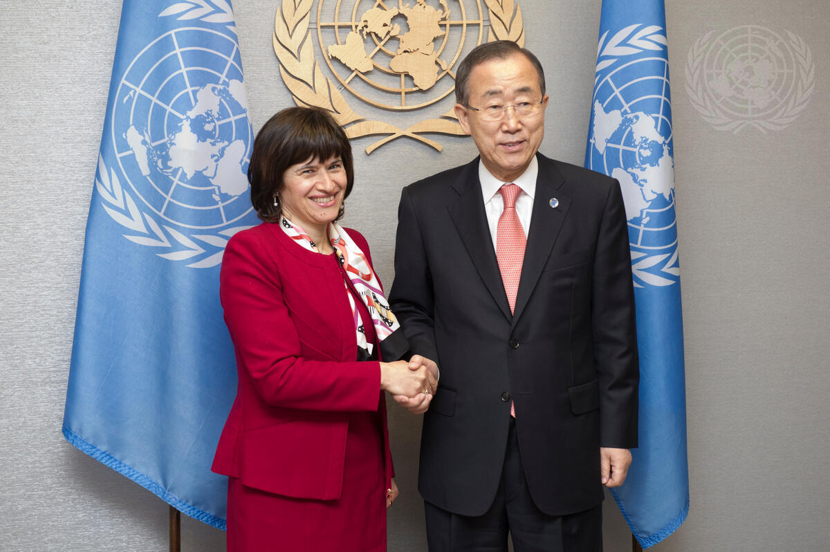 Secretary-General Ban Ki-moon (right) meets with Antonella Mularoni, Minister for Foreign Affairs of the Republic of San Marino.