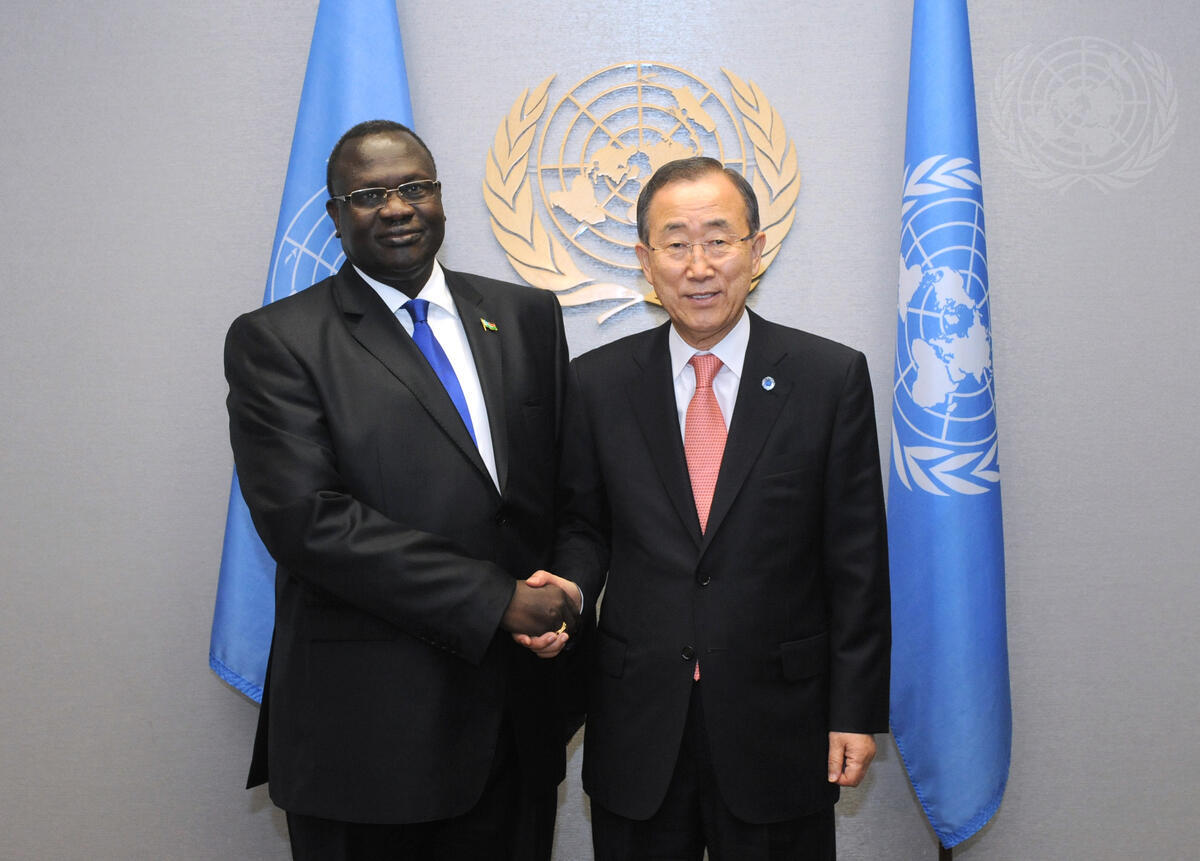 Secretary-General Ban Ki-moon (right) meets with Riek Machar Teny-Dhurgon, Vice-President of the Republic of South Sudan.