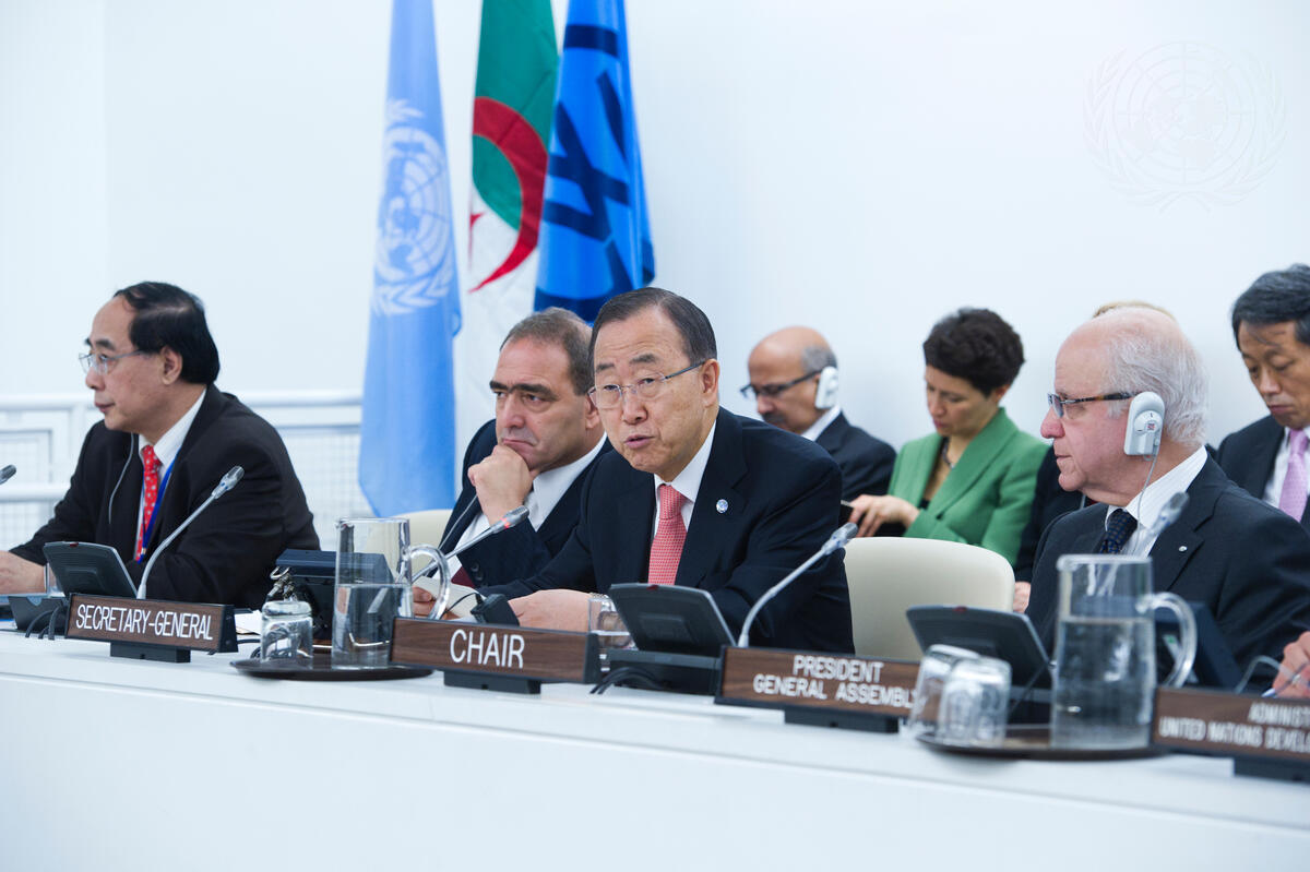 With Mr. Ban on the podium, from left: Wu Hongbo, Under-Secretary-General for Economic and Social Affairs; Mourad Benmehidi, Permanent Representative of Algeria to the UN; and Mourad Medelci, Algeria’s Minister for Foreign Affairs and Chair of the G77.