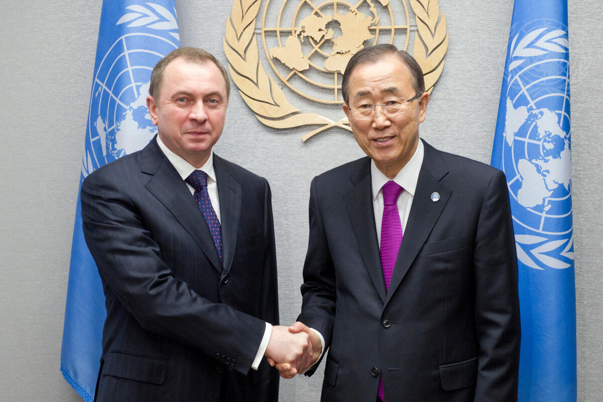 Secretary-General Ban Ki-moon (right) meets with Vladimir Makei, Minister for Foreign Affairs of the Republic of Belarus.