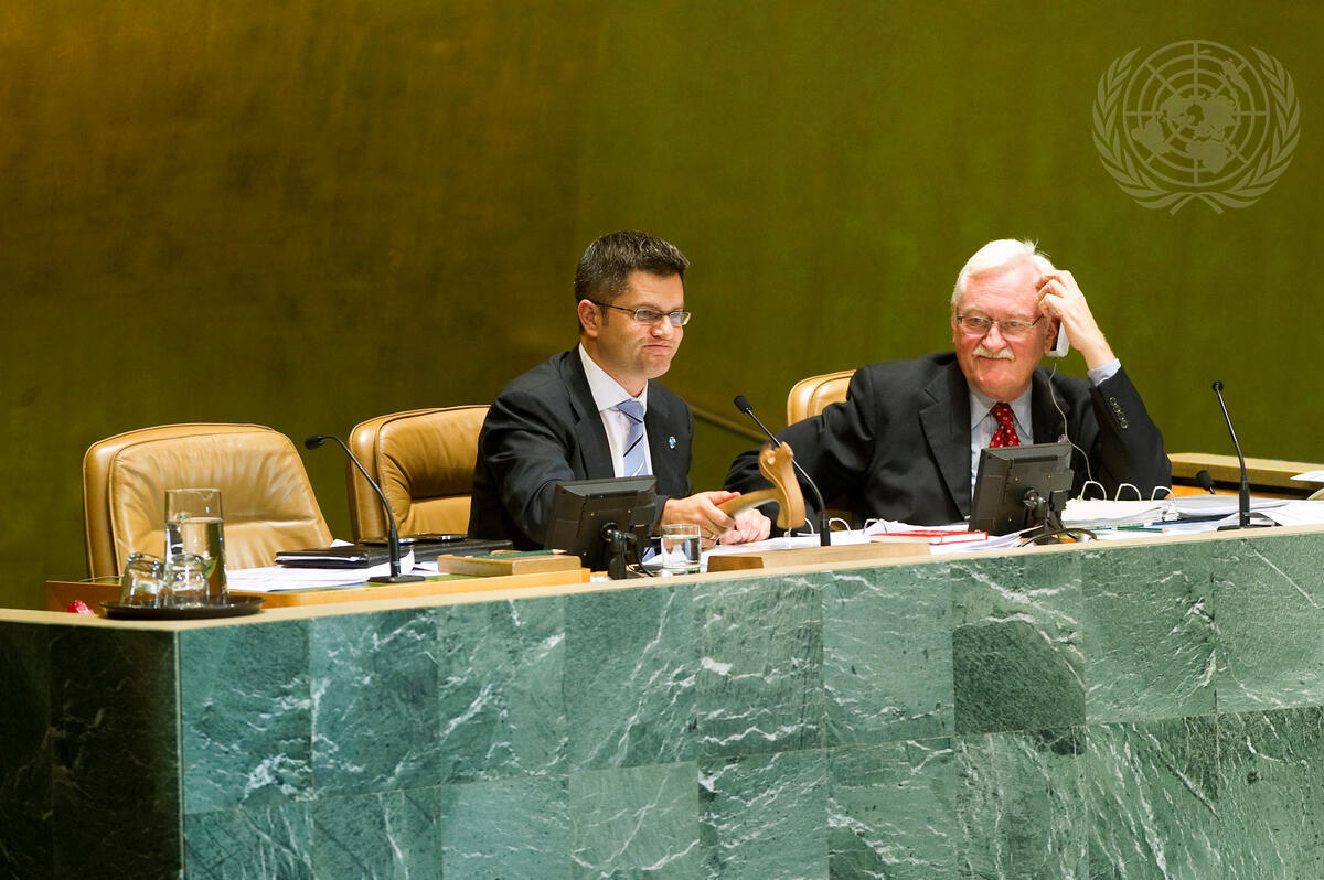 Vuk Jeremic (left), President of the sixty-seventh session of the General Assembly, gavels to conclusion the session's general debate. At right is Jean-Jacques Graisse, Acting Head for General Assembly and Conference Management.