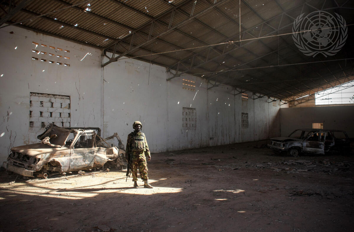 A Kenyan soldier with the African Union Mission in Somalia (AMISOM) stands in front of vehicles that were destroyed a week earlier by Kenyan Air Force missile strikes inside a warehouse at Kismayo Airport, once firmly under the control of the Al Shabaab militant group.